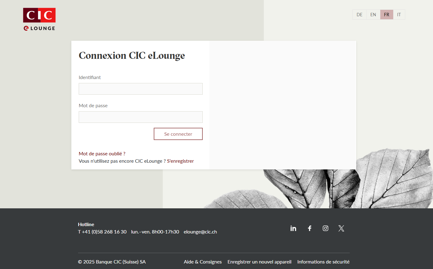 Si vous n’avez pas reçu de SMS, veuillez contacter la Hotline CIC eLounge Hotline au +41 (0)58 268 16 30. La Hotline se tient à votre disposition du lundi au vendredi de 8 h 00 à 17 h 30 (sauf jours fériés officiels).