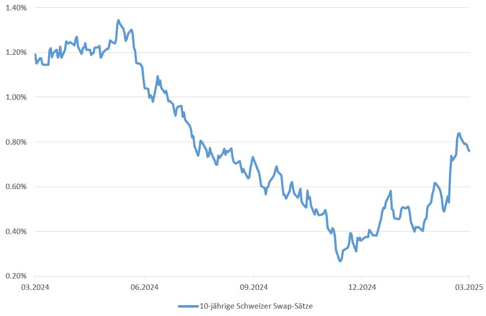 Während die Schweizer Nationalbank den Leitzins im März ein weiteres Mal gesenkt hat, ist die heimische Zinskurve im Jahr 2025 ab einer Laufzeit von 12 Monaten deutlich angestiegen. Insbesondere die fiskalpolitischen Pläne in Europa weckten die Hoffnung auf ein künftig stärkeres Wachstum der Eurozone und insbesondere auf höhere Preise. Dies führte zu steigenden Zinsen in der Schweiz und Europa, was die Anleihenmärkte entsprechend belastete. Obwohl wir der künftigen Entwicklung von Schweizer Obligationen positiv gegenüberstehen, dürfte das Kurspotenzial im Jahr 2025 begrenzt bleiben. Unser Fokus liegt auf Unternehmensanleihen von soliden Schuldnern mit kürzeren Laufzeiten. (muc)