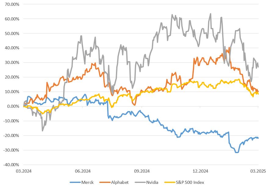 Das US-Börsenjahr begann ungewohnt schwach und volatil. Hauptgründe dafür sind die weiterhin starken Wirtschaftsdaten und die Politik von Präsident Trump, der mit der Androhung von Importtarifen auf ausländische Waren die Weltwirtschaft auf Trab hält. Wir rechnen weiterhin mit einer volatilen Seitwärtsbewegung an den Märkten, bis die Leitzinssenkungen in den USA wiederaufgenommen werden, was für die Sommermonate erwartet wird. Wir bleiben für das Börsenjahr 2025 optimistisch. Wir empfehlen die Titel NVIDIA, Merck und Alphabet. (amm)