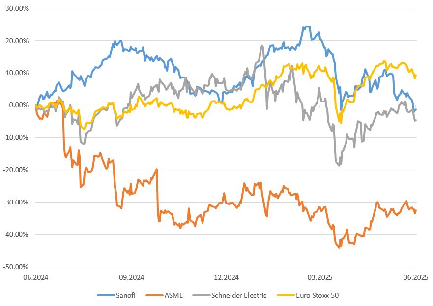 Die EZB hat am 5. Juni ihre Leitzinsen ein weiteres Mal gesenkt - es ist die achte Zinssenkung seit Mitte 2024. Neu wird ein geringeres BIP-Wachstum (1,1% statt 1,2%) und eine niedrigere Inflation (2% statt 2,3%) erwartet. Die Unsicherheit bezüglich der Handelspolitik belastet die Investitionen und Exporte. Steigende öffentliche Ausgaben für Verteidigung und Infrastruktur werden das Wachstum jedoch mittelfristig stützen. Unser Fokus liegt auf zyklischen Werten sowie auf Qualitätstiteln. Unsere Empfehlungen für Europa bleiben ASML, Sanofi und Schneider Electric. (wan)