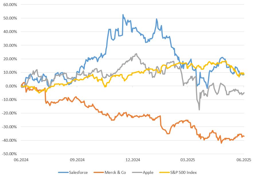 Der Liberation Day hat die Märkte kurzzeitig stark unter Druck gesetzt. Die US-Märkte konnten sich in den darauffolgenden Monaten jedoch erholen und notieren mittlerweile höher als zu Jahresbeginn. Es herrscht weiterhin Unsicherheit an den Märkten. Die Präsidentschaft von Trump, der Krieg in der Ukraine und die Spannungen im Nahen Osten sind nur einige der aktuellen Themen, die die Märkte beschäftigen. Wir rechnen im Sommer mit einer volatilen Seitwärtsbewegung an den US-Märkten. Unsere Empfehlungen sind die Titel von Salesforce, Merck und Apple. (amm)