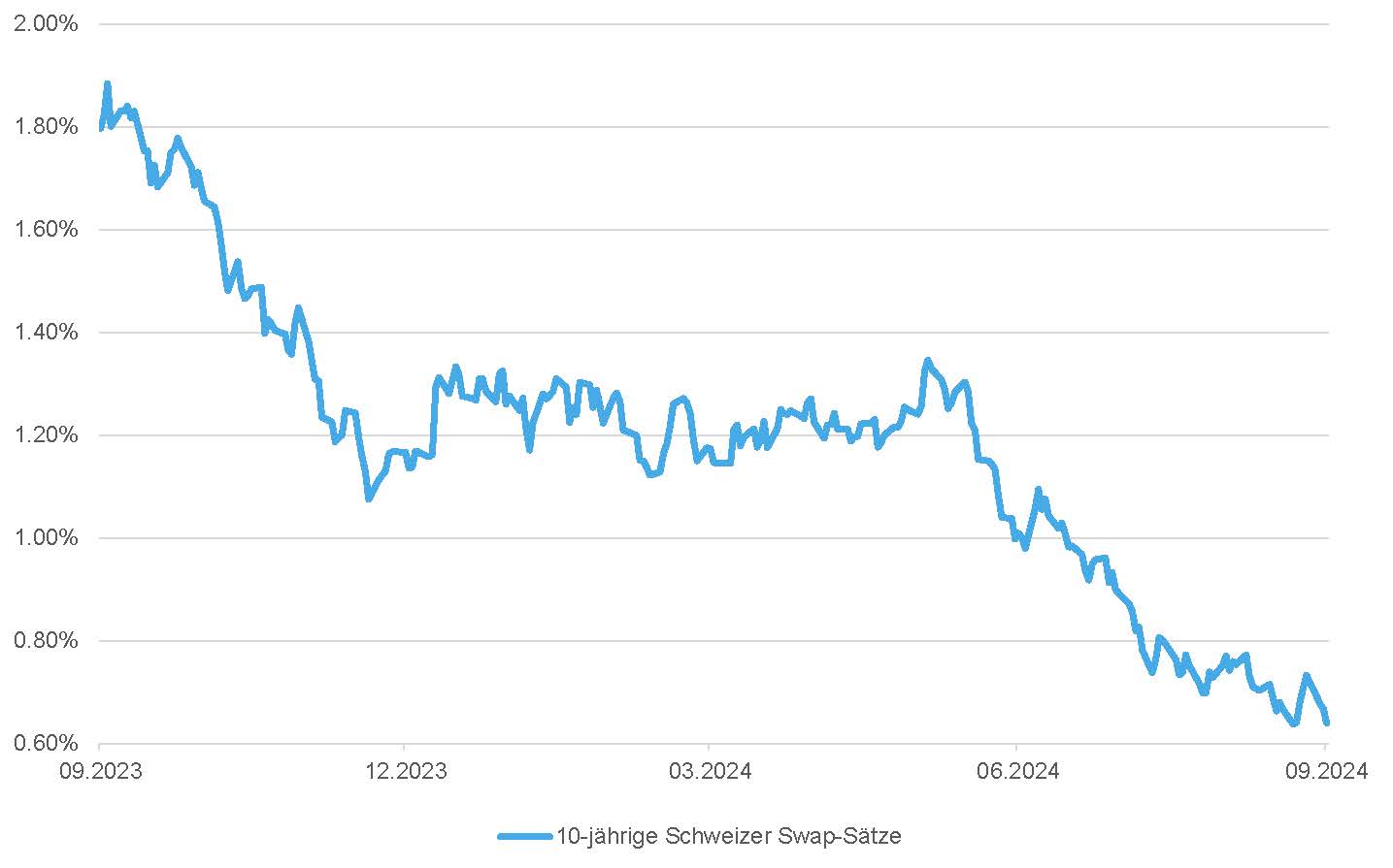 Die Inflation in der Schweiz nahm zuletzt stärker ab als erwartet. Der Umstand, dass diese auch bei den für die Schweiz wichtigen Handelspartnern rückläufig ist, führt dazu, dass weniger davon importiert wird. Die wieder stärkere Heimwährung hemmte die Teuerung zusätzlich. Im aktuellen Jahr hat sich die gesamte Schweizer Zinskurve abgesenkt. Weitere Erhöhungen des hypothekarischen Referenzzinssatzes sind entsprechend unwahrscheinlich, weshalb der zuletzt erhöhte Beitrag der Mietpreise im Konsumentenpreisindex ein temporärer Effekt darstellen dürfte. Im aktuellen Jahr wird mit einer durchschnittlichen Inflation im Bereich von 1,1% gerechnet, wobei dieser Wert im Jahr 2025 voraussichtlich weiter abnehmen wird. Die Strompreise für Haushalte werden im kommenden Jahr im Mittel um 10% sinken und der historisch starke Schweizer Franken könnte die SNB vor die Herausforderung stellen, dass sich die Teuerung trotz der bereits getätigten Zinssenkungen in Zukunft stärker abschwächt als gewünscht. (muc)
