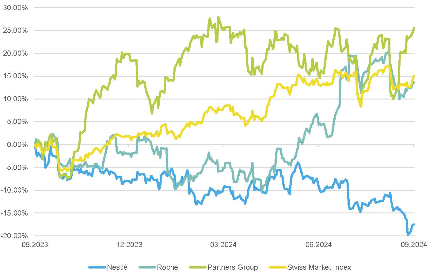 Im dritten Quartal tendierte der Schweizer Gesamtaktienmarkt gemessen am SPI zwar praktisch unverändert, auf Titelebene kam es allerdings zu starken Bewegungen. Insbesondere Nestlé verlor nach schwachen Halbjahreszahlen rund 8% und verhinderte somit eine bessere Performance. Da die Stimmung der Marktteilnehmer gegenüber den beiden Indexschwergewichten Nestlé und Roche viel zu negativ ist, besteht erhebliches Aufwärtspotenzial. Unter den Blue Chips gefallen uns zudem Partners Group, bei den Nebenwerten favorisieren wir Bachem, Adecco und Georg Fischer.