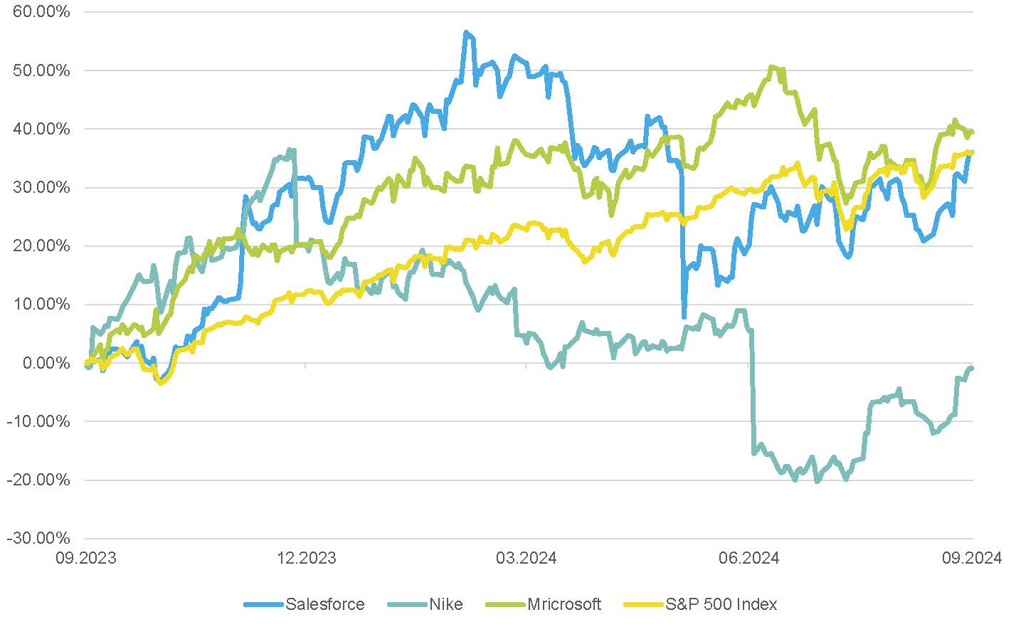 Der US-Aktienmarkt wird von der Leitzinssenkung der FED zu neuen Höchstkursen getrieben. Auch für die nächsten Monate wird dies ein Treiber der Märkte bleiben. Die Mitglieder des Offenmarktausschusses, welche über die Zinspolitik entscheiden, rechnen bis Ende 2025 mit einem Zinssatz von 3,4%, was weitere 5–6 Zinssenkungen impliziert. Dazu kommt noch der Wahlkampf in den USA, welcher historisch die Märkte positiv unterstützt hat. Wir rechnen mit steigenden Märkten und empfehlen die Titel Salesforce, Nike und Microsoft. (amm)