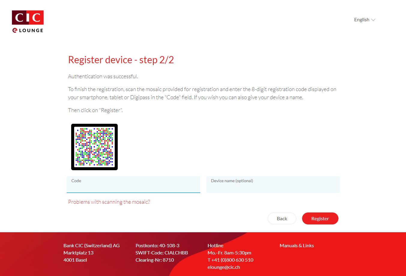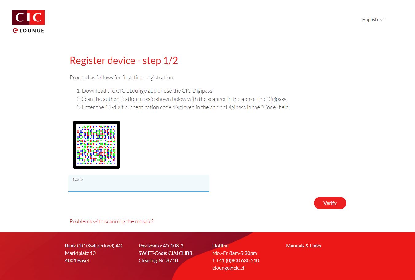 Now open the CIC eLounge app on your mobile device or switch on the CIC Digipass and scan the authentication mosaic displayed in your web browser or which you received in a separate letter.
