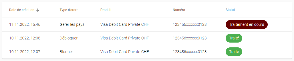 Les changements effectués dans la gestion des cartes sont valables immédiatement. Sous « Mes ordres », vous pouvez encore vérifier si le statut est « Traité ».