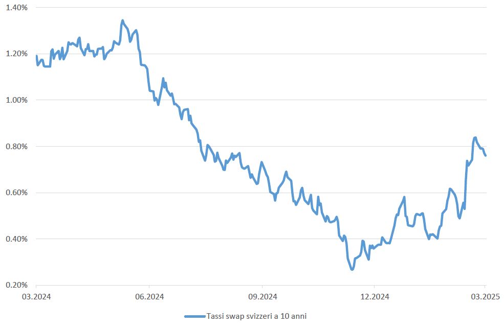Mentre la Banca nazionale svizzera ha abbassato ancora una volta il tasso guida a marzo, nel 2025 la curva nazionale dei rendimenti è salita significativamente a partire dalla scadenza di 12 mesi. In particolare, i piani di politica fiscale in Europa hanno destato la speranza di una crescita più forte nell’eurozona in futuro e, soprattutto, di un aumento dei prezzi. Ne è conseguito un aumento degli interessi in Svizzera e in Europa che ha gravato sui mercati obbligazionari. Sebbene siamo positivi riguardo al futuro andamento delle obbligazioni svizzere, nel 2025 il potenziale di prezzo potrebbe rimanere limitato. La nostra attenzione si concentra sulle obbligazioni societarie di debitori solidi a breve scadenza. (muc)