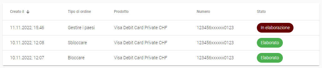 Le modifiche apportate in Gestione carte sono valide immediatamente. In «I miei ordini» potete verificare se lo stato è «Elaborato».